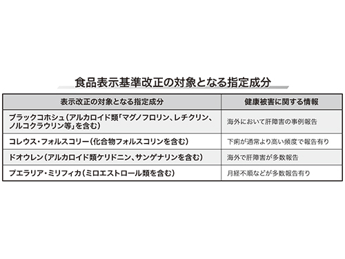 消費者の健康被害を受け、4種類の指定成分が含まれた健康食品や食品の食品表示基準を改正する。(図参照)指定成分含有食品に、指定成分の表示をしないと、「消費者に伝わらない」「健康被害にあった場合、情報収集に支障が出る」ことから、表示の義務化を決めた。