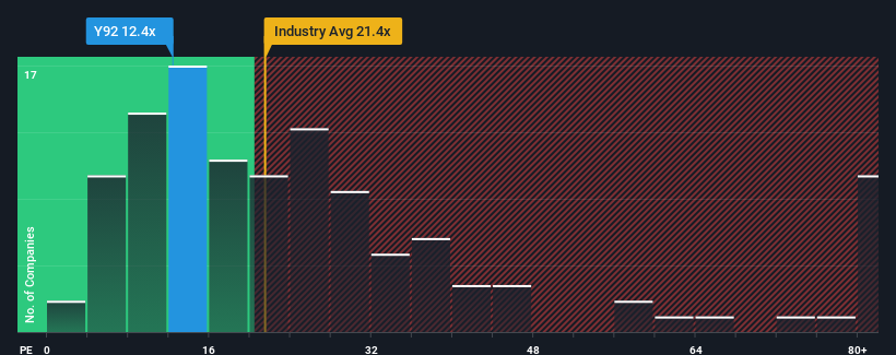 It's not a stretch to say that Thai Beverage Public Company Limited's (SGX:Y92) price-to-earnings (or "P/E") ratio of 12.4x right now seems quite "middle-of-the-road" compared to the market in Singapore, where the median P/E ratio is around 12x. Although, it's not wise to simply ignore the P/E without explanation as investors may be disregarding a distinct opportunity or a costly mistake.